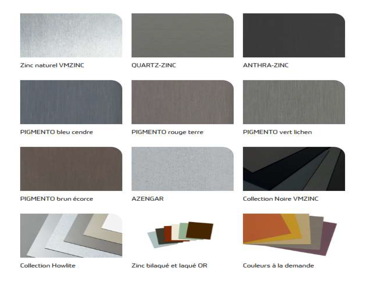 Le zinc peut être naturel ou avoir différentes teintes, suivant les gammes de nos fournisseurs, VMZINC ou Rheinzink.